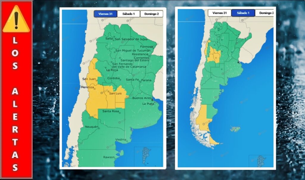 Por tormentas: El alerta nivel amarilla abarca al sur de Córdoba, Mendoza, San Luis y extremo norte de La Pampa.