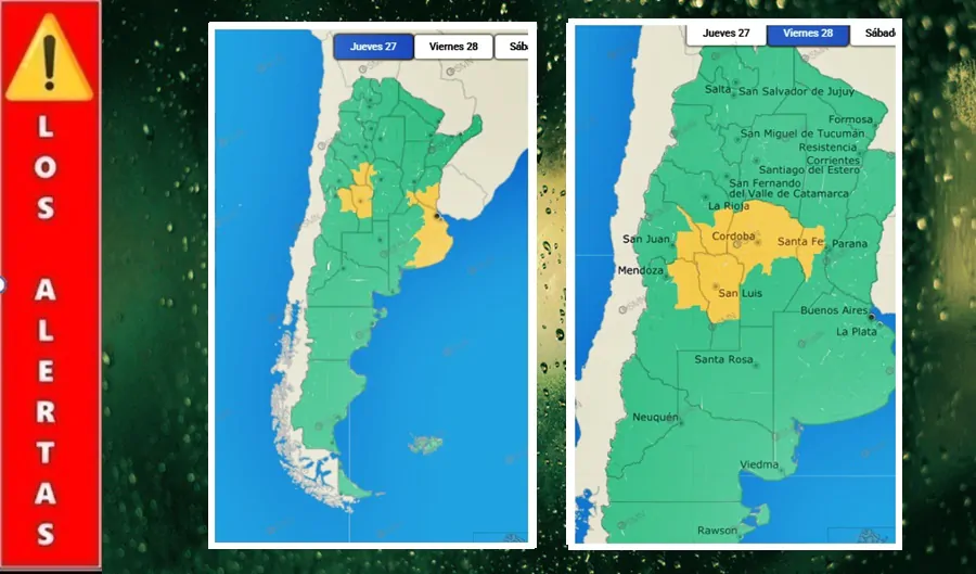 Alerta amarilla por tormentas: El aviso a corto plazo abarca sur de La Rioja, noreste de Mendoza, centro y norte de San Luis, centro y este de Buenos Aires, sudeste de Santa Fe y sur de Entre Ríos.
