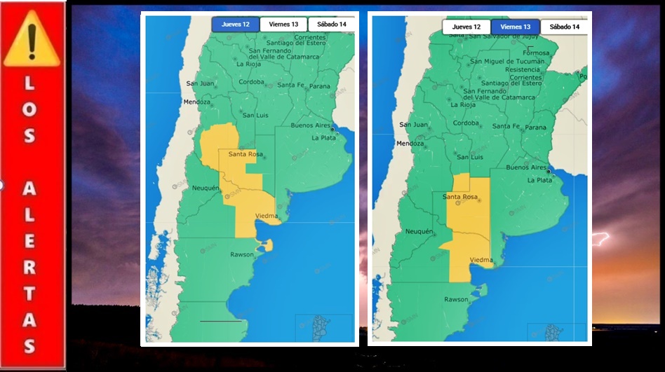 Por tormentas: El alerta nivel amarilla abarca al noroeste del país, abarcando a la región centro de Salta, este de Jujuy, oeste de Formosa, Chaco, noroeste de Corrientes, sur de Mendoza, centro y este de Río Negro, centro y oeste de La Pampa.