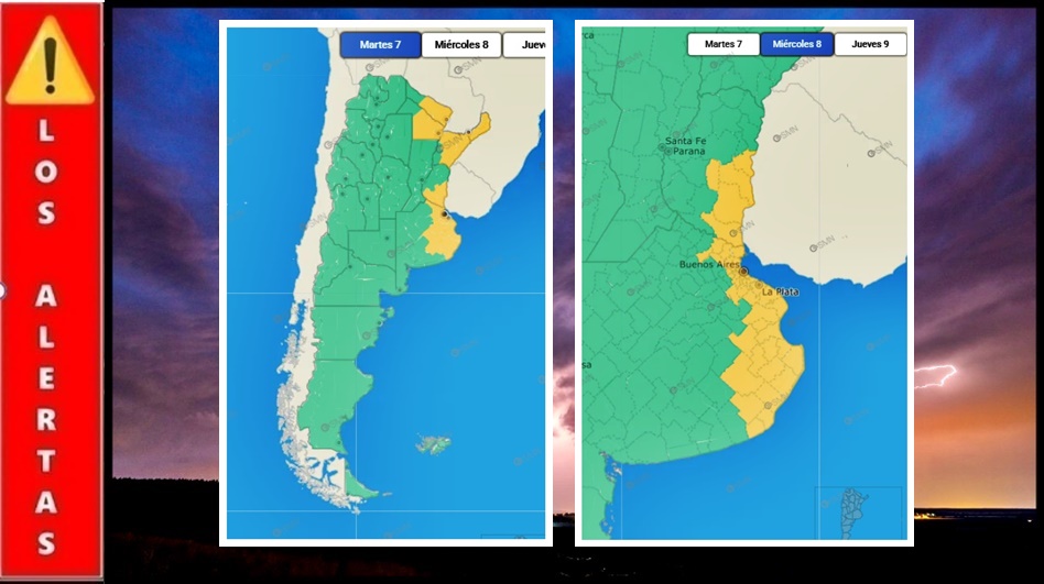 Por tormentas: La alerta amarilla por tormentas abarca a la franja sur de Entre Ríos, centro y este de Buenos Aires, Corrientes, Misiones, centro y este de Chaco, centro y este de Formosa.
