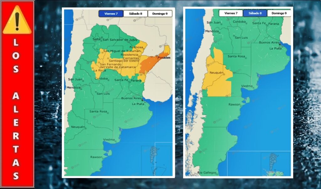 Por tormentas: El alerta nivel amarilla y naranja abarca al sur de Santiago del Estero, centro y norte de Santa Fe, norte de Entre Ríos, Corrientes, Misiones, franja este de Chaco y franja este de Formosa.