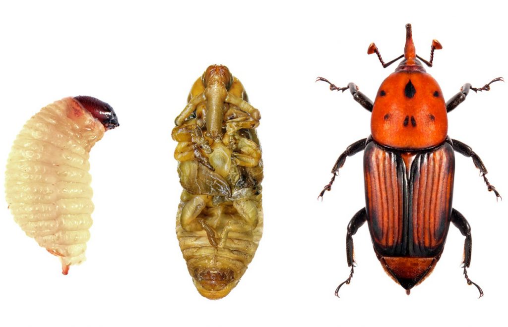 Al nacer, las larvas perforan el tronco (estípite) y la corona, excavando túneles que pueden medir más de un metro de largo, convirtiéndolo en un perfecto y peligroso devorador.
