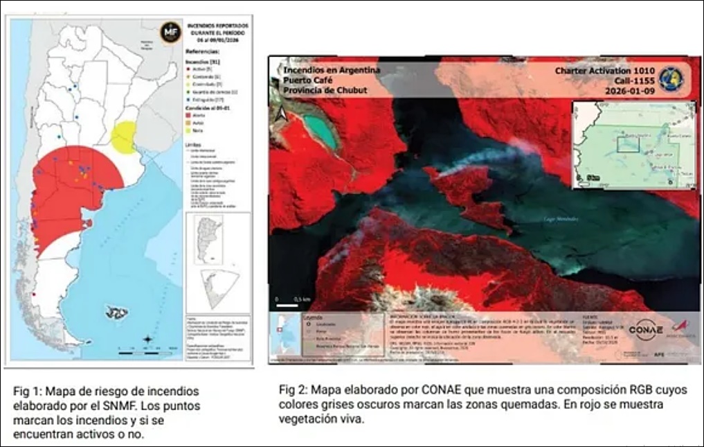 La gravedad de la situación quedó registrada en las recientes imágenes de la CONAE (10 de enero de 2026). Las capturas satelitales revelan la magnitud del desastre en la zona de Puerto Café, dentro del área de influencia del Parque Nacional Los Alerces, donde las cicatrices de quemado —visibles en tonos grises— y las densas plumas de humo evidencian el avance del fuego sobre el ecosistema nativo.
