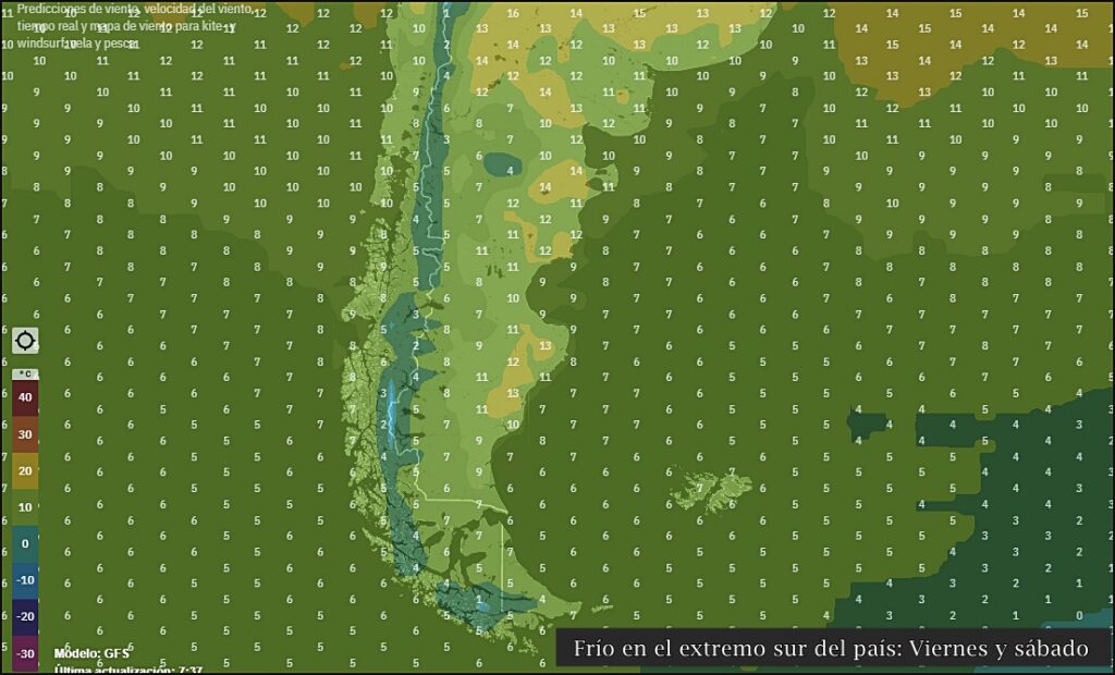 El ingreso de aire frío en la Patagonia estará dejando nevadas en distintas áreas de la cordillera de los Andes y alrededores, como también así en Santa Cruz y Chubut, con lluvias y nevadas entre este viernes y el sábado. La temperatura máxima en estas regiones rondará los 5°C/ 7°C y 11°C,
