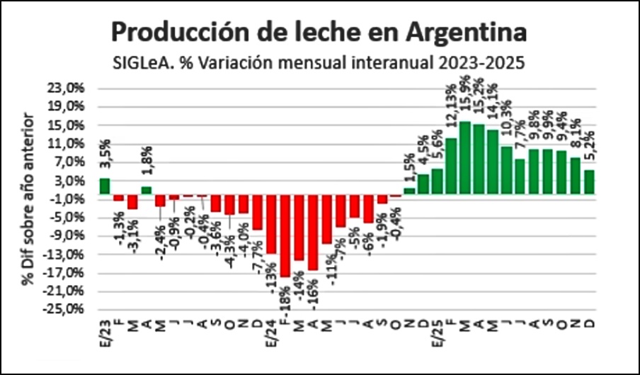 De acuerdo con los datos oficiales del sistema SIGLeA/MINAGRI, la producción nacional de leche experimentó un crecimiento vigoroso: