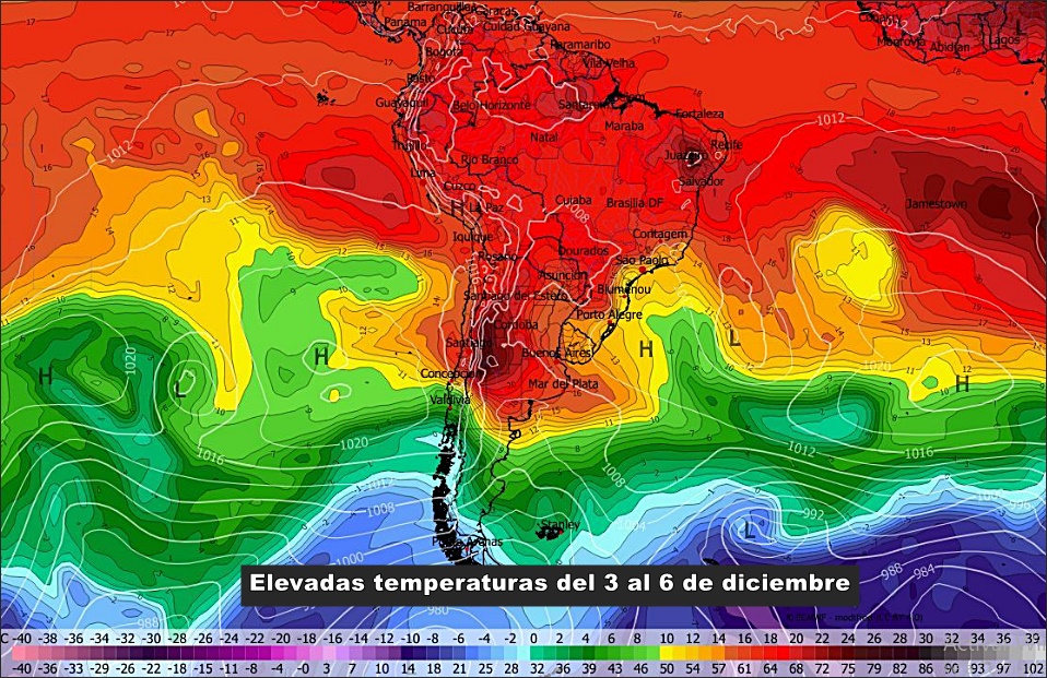 Entre este el miércoles 3 al sábado 6 de diciembre, las temperaturas estarán aumentando de manera sostenida, influyendo a gran parte del norte y centro del país con registros veraniego, con marcas máximas de 33°C, 35°C y 39°C, pudiéndose superar las marcas estimadas, llegando a máximas que promediarán los 40°C y 43°C. Las provincias bajo este régimen anómalo de temperatura están: Formosa, franja este de Salta, Tucumán, Santiago del Estero, norte de Santa Fe, Chaco entre otras regiones.