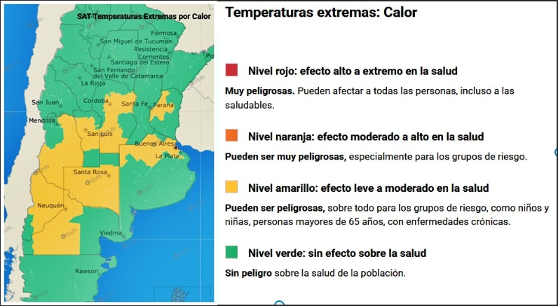 La alerta por temperaturas elevadas extremas abarca al lunes 29 y martes 30 de diciembre, involucrando al sur y área central e Córdoba, centro de San Luis, sur y centro de Mendoza, La Pampa, Neuquén, centro y oeste de Río Negro, norte de Buenos Aires y franja este de Entre Ríos.
