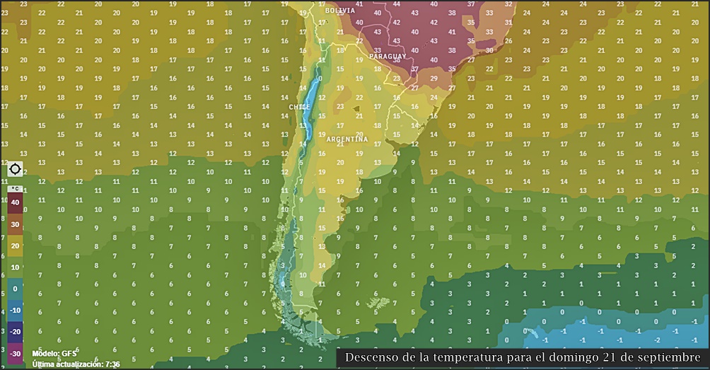 La temperatura estaría bajando el domingo 21 de septiembre, mediante el avance de un frente frío, con viento cambiando al sector sur y el desarrollo de lluvias.