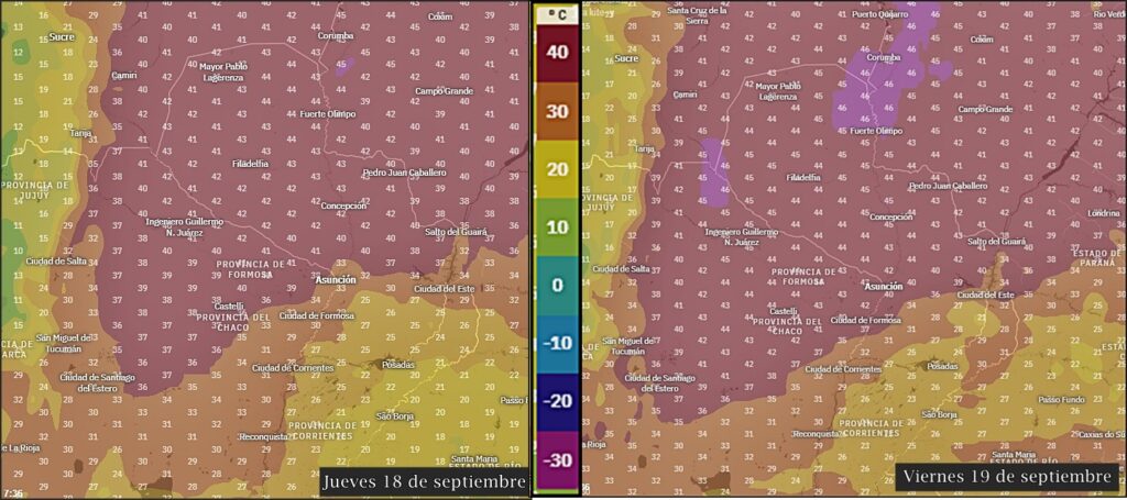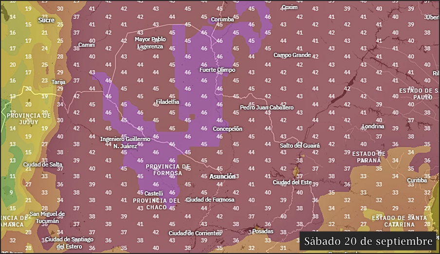 Para las provincias de Formosa, este de Salta, norte de Chaco y Santiago Del Estero, se pueden estar alcanzando los 37°C y 40°C, hasta los 42/45°C inclusive.