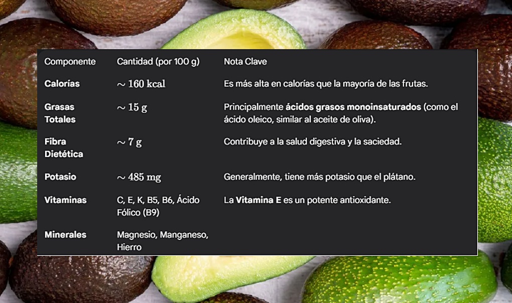 La palta se destaca entre las frutas por su composición única, siendo excepcionalmente rica en grasas saludables y baja en azúcares. Esto es lo que tenés que saber sobre el contenido alimenticio de esta fruta: