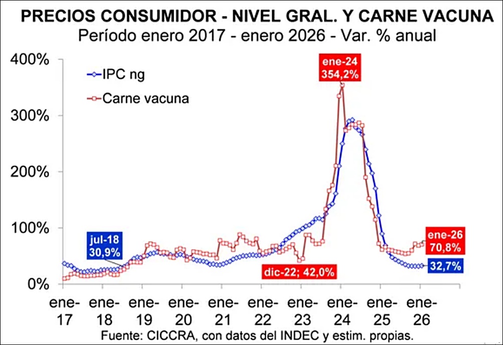 - Inflación ganadera: Mientras que el índice general de precios (IPC-GBA) subió un 2,8% en enero, el rubro de carnes y derivados escaló un 4,4%, superando ampliamente el promedio.