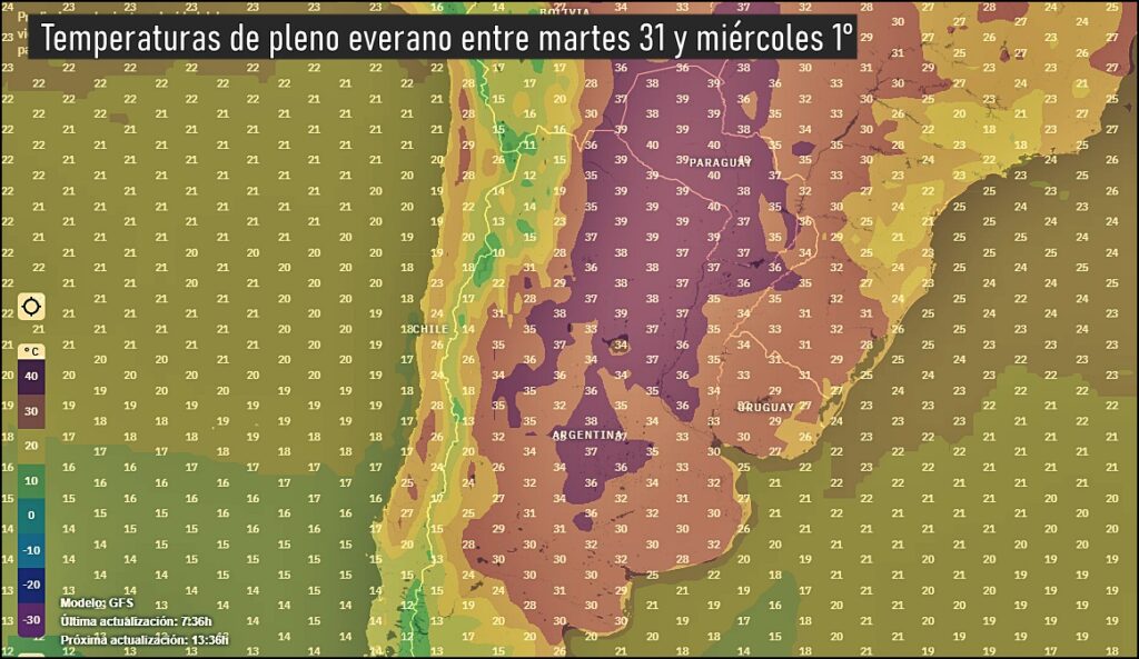 Para el tramo final de marzo se prevé que recomponga la circulación de viento norte cálido y más húmedo, provocando un pico de ascenso térmico sostenido por varios, días, sobre todo este lu8nes, el martes 31 y miércoles 1°, extendiéndose hasta el 2 de abril, inclusive, con registros veraniegos que van a rondar los 33°C, 35°C y 38°C desde el norte al centro del país. La sensación térmica rondará los 40°C y 43°C en algunas regiones, con ambiente saturado con un porcentaje de aire húmedo cercano al 60 y 80%.