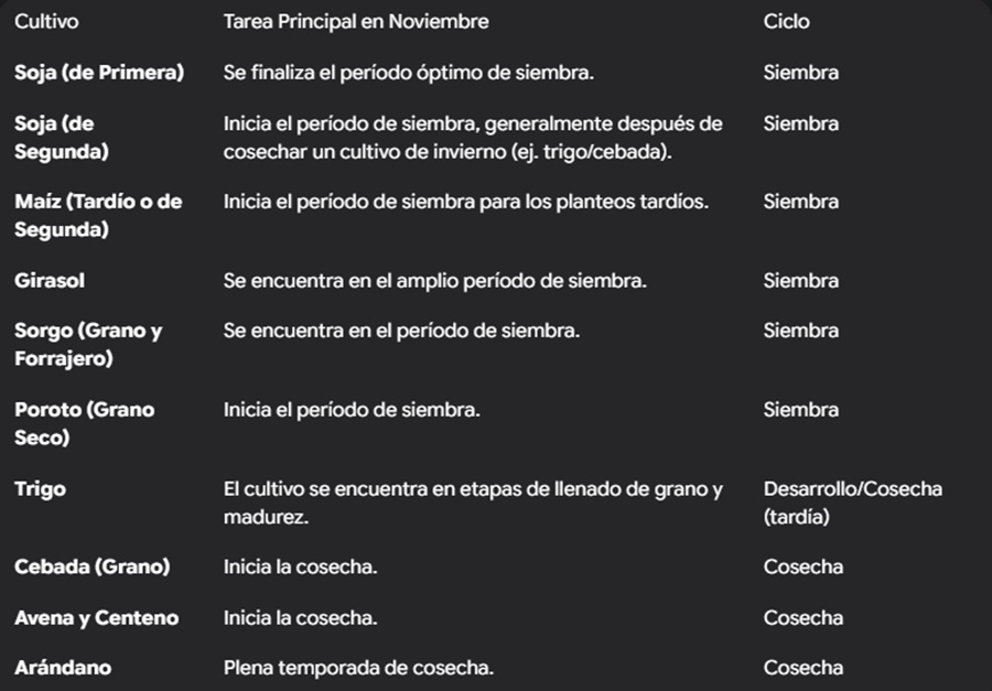 Noviembre es un mes clave en el calendario agrícola de Argentina, ya que se encuentra en plena primavera y marca el pico de las siembras de los cultivos de verano, mientras que se dan las últimas cosechas de los cereales de invierno.