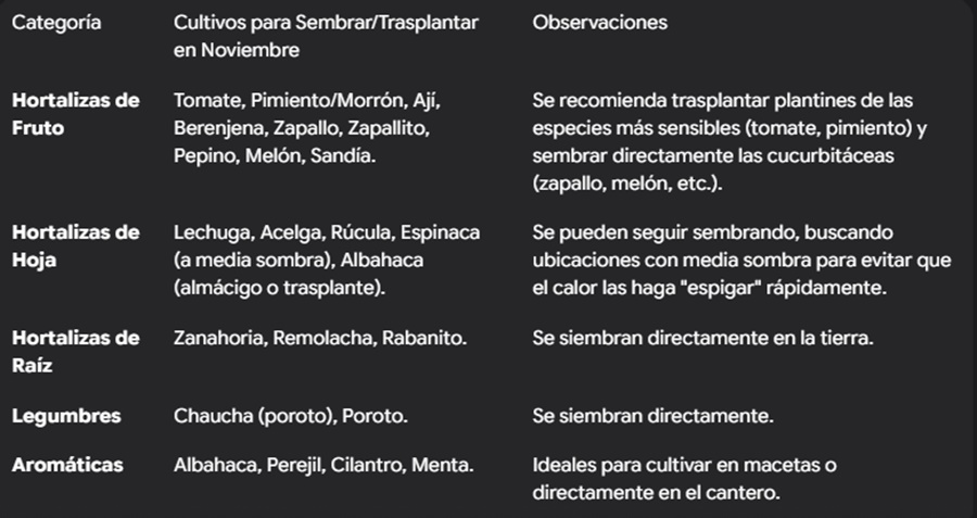 A continuación, se detalla el calendario de cultivo y las tareas agrícolas principales para el mes de noviembre en Argentina, diferenciando entre cultivos extensivos y de huerta familiar: