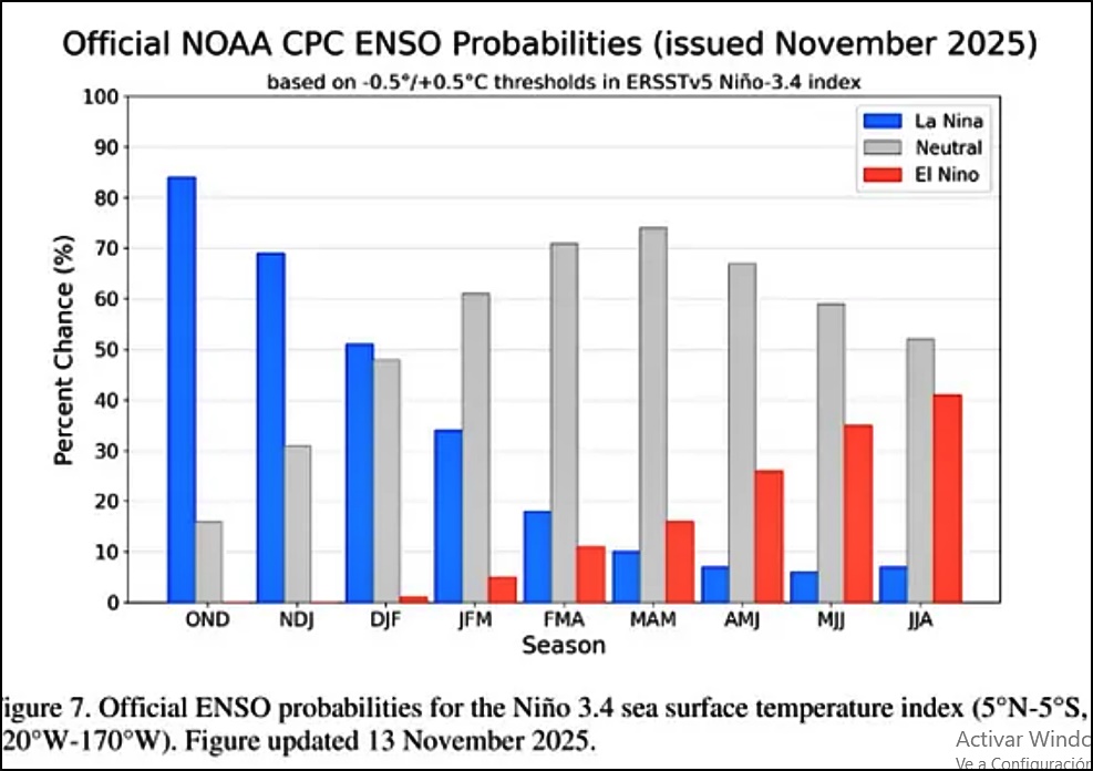 - El Niño en el Horizonte: Por otro lado, las probabilidades de un retorno de El Niño se mantendrán bajas (por debajo del 20%) hasta el trimestre marzo-abril-mayo de 2026, pero se espera que comiencen a aumentar gradualmente a partir de abril y mayo.