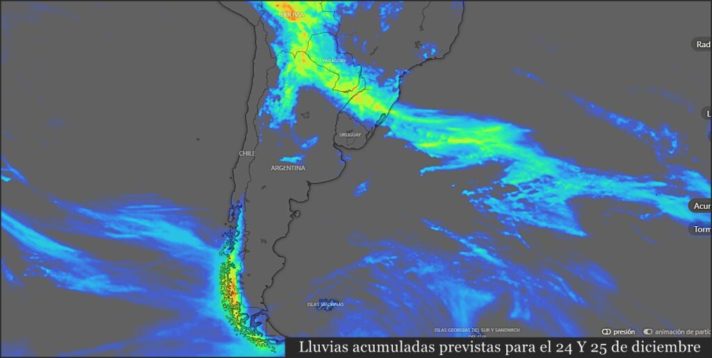 Desde el mismo miércoles y en parte del jueves 25 de diciembre, el tiempo será inestable en las provincias de San Luis y Córdoba, con probables lluvias asociadas a chaparrones y tormentas en algunas áreas de estas provincias. Mientras que para las provincias de Mendoza y San Juan el tiempo será más estable.