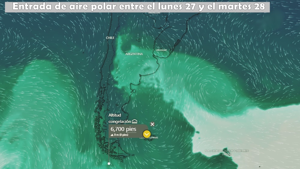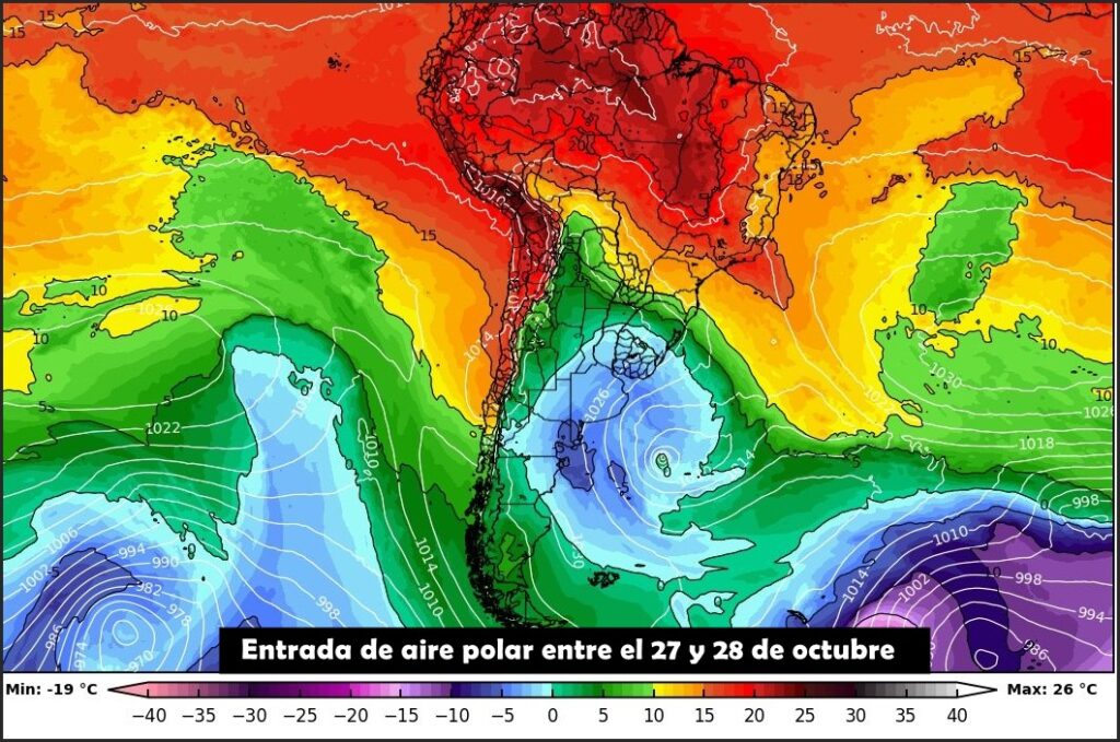Los pronósticos ya están anticipando un importante cambio de aire y con un marcado descenso de la temperatura para la semana que se viene, producto del continuo fortalecimiento y avance de una masa de aire polar. Este fenómeno, asociado a una vaguada de aire frío de origen Polar, traerá consigo intensos vientos del sur con ráfagas y no solo un marcado descenso térmico, sino también un aumento en la inestabilidad atmosférica, lo que podría generar precipitaciones en forma de lluvias y nieve en diversas regiones a partir del mismo lunes 27 de octubre.